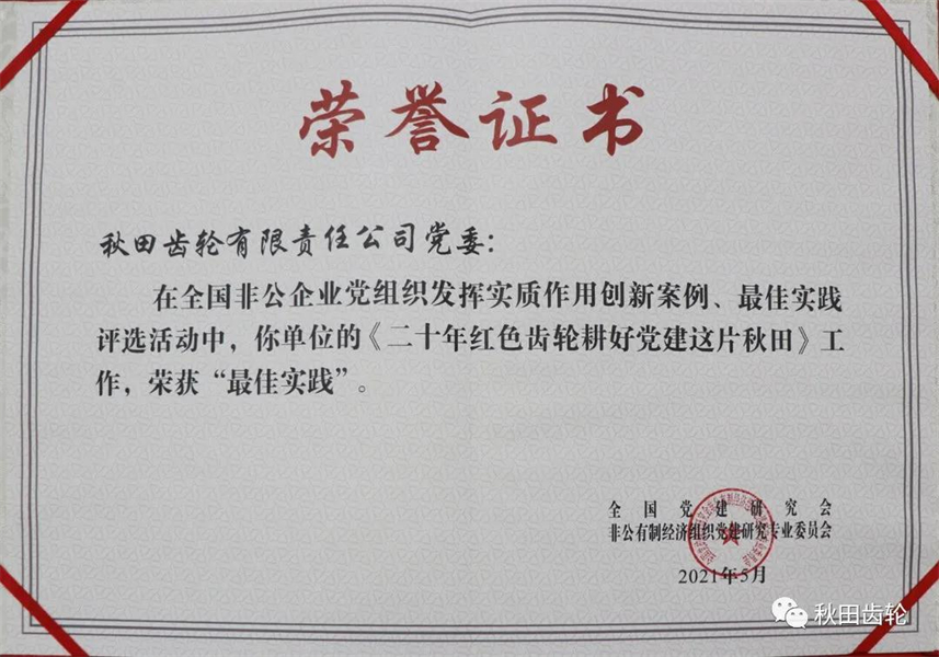 6月29日,在全國非公企業(yè)黨組織發(fā)揮實(shí)質(zhì)作用創(chuàng )新案例、最佳實(shí)踐評選活動(dòng)中,秋田黨委《二十年紅色齒輪耕好黨建這片秋田》工作,榮獲“最佳實(shí)踐”。(供稿:周小渝)